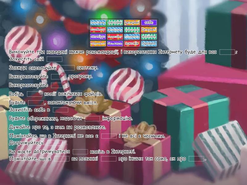 Виконуйте три наведені нижче рекомендації, і використання Інтернету буде для вас ____: Захистіть свій ____ Завжди оновлюйте ____ систему. Використовуйте ____ програму. Використовуйте ____. Робіть ____ копії важливих файлів. Будьте ____, завантажуючи вміст. Захистіть себе в ____ Будьте обережними, надаючи ____ інформацію. Думайте про те, з ким ви розмовляєте. Пам’ятайте, що в Інтернеті не все є ____ і не всі є чесними. Дотримуйтесь ____ Ви маєте дотримуватися ____ навіть в Інтернеті. Пам’ятайте, що в ____ ви повинні ____ про інших так само, як про ____.