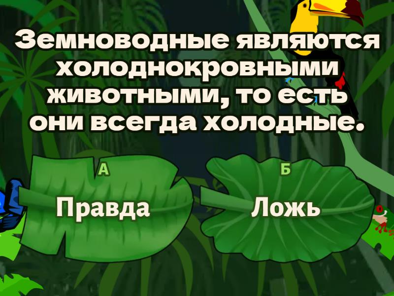 1) Земноводные являются холоднокровными животными, то есть они всегда холодные. a) Правда b) Ложь 2) Кожа амфибий покрыта мелкими чешуями, которые трудно увидеть под слоем слизи. a) Правда b) Ложь 3) Амфибии бывают хвостатые, бесхвостые и безногие. a) Правда b) Ложь 4) Тело состоит из головы, туловища и двух пар четырехпалых конечностей. a) Правда b) Ложь 5) Амфибии могут двигать головой во всех направлениях: вверх и вниз, вправо и влево. a) Правда b) Ложь 6) Отделы конечностей земноводных такие же, как и у человека. a) Правда b) Ложь 7) Оплодотворение внутреннее, а развитие наружное (в окружающей среде, а не в теле матери). a) Правда b) Ложь 8) Существуют амфибии, способные размножаться на личиночной стадии. a) Правда b) Ложь 9) Земноводные обитают исключительно во влажных тропиках. a) Правда b) Ложь 10) Оцепенение — состояние резкого понижения жизненной активности. a) Правда b) Ложь 11) В черепе лягушки есть мозговой и лицевой отделы.  a) Правда b) Ложь 12) У лягушки есть пальцы. a) Правда b) Ложь 13) Некоторые амфибии являются гермафродитами. a) Правда b) Ложь 14) Резонаторные мешки нужны самкам для поиска самца. a) Правда b) Ложь 15) Головастик лягушки сильно похож на рыбу: имеет жабры и боковую линию. a) Правда b) Ложь 16) Аксолотль - личинка амбистомы и способен к размножению. a) Правда b) Ложь 17) В процессе развития хвост у головастиков отваливается и служит ценным кормом для многих рыб. a) Правда b) Ложь