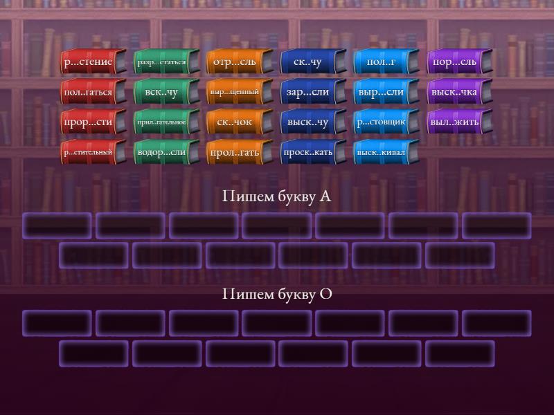 Пишем букву А: р...стительный, выр...щенный, разр...статься, прор...сти, р...стение, отр...сль, прол..гать, прил..гательное, пол..гаться, проск..кать, ск..чу, ск..чок, выск..кивал, Пишем букву О: выр...сли, водор...сли, зар...сли, пор...сль, р...стовщик, выл..жить, пол..г, вск..чу, выск..чу, выск..чка,
