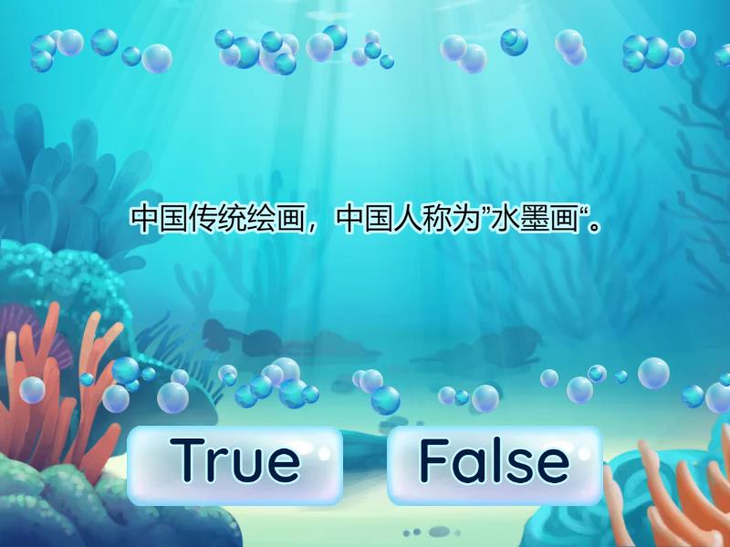 True: 中国传统绘画,中国人称为”水墨画“。, 现今的图画,大多数都是挂在墙上欣赏的。, 《清明上河图》是要放在桌上欣赏的。, 中国古代有一种放在桌上欣赏的画,叫做”手卷“, 中国古代有一种放在桌上欣赏的画,叫做”长卷“, 中国古代有一种放在桌上欣赏的画,叫做”图卷“, 手卷宽约一尺,长度从几尺到几十尺都有。, 《清明上河图》是由宋朝画家张择端创作的。, 有人把中国画的手卷,比作古代的电影。, 文人画,是为了表达作者的思想和心事。, 不在意画面细节,主要为了体现精神和意境的中国画,叫”写意画“。, 画面真实细致,刻画每一个细节的中国画,叫“工笔画”。, False: 现今的图画,大多数都是放在桌上欣赏的。, 《清明上河图》是要挂在墙上欣赏的。, 手卷宽约五尺,长度从几尺到几十尺都有。, 手卷是用一幅画把同一时间,同一场景的画面连接起来。, 把不同的时间和空间结合起来的画面,只有一个焦点,也叫”散点透视“。, 《清明上河图》是由唐朝画家张择端创作的。, 《清明上河图》画的是清朝首都汴梁城内外的景象。, 文人画《六君子图》中画的是六个好朋友。, 齐白石画的马,是为了表现出人的精神。, 徐悲鸿画的虾不仅”形似“,而且”神似“,活灵活现的。, 齐白石的虾和徐悲鸿的马,用的都是工笔画的手法。, 《清明上河图》是一幅写意中国画。,