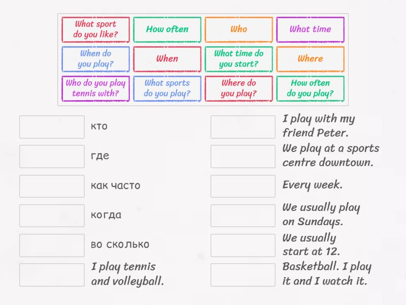 Who - кто, Where - где, How often - как часто, When - когда, What time - во сколько, What sports do you play? - I play tennis and volleyball., Who do you play tennis with? - I play with my friend Peter., Where do you play? - We play at a sports centre downtown., How often do you play? - Every week., When do you play? - We usually play on Sundays., What time do you start? - We usually start at 12., What sport do you like? - Basketball. I play it and I watch it.,