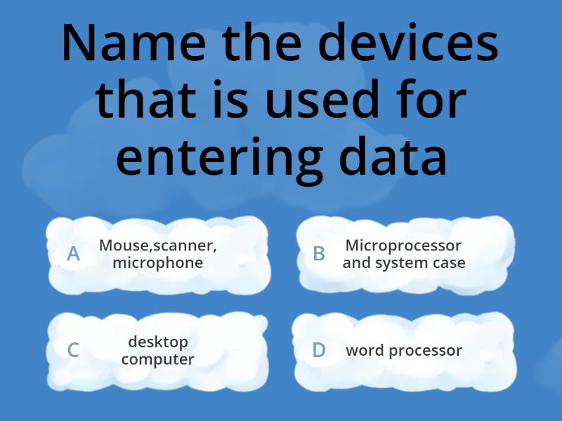 1) Name the devices that is used for entering data  a) Mouse,scanner, microphone b) Microprocessor and system case c) desktop computer d) word processor