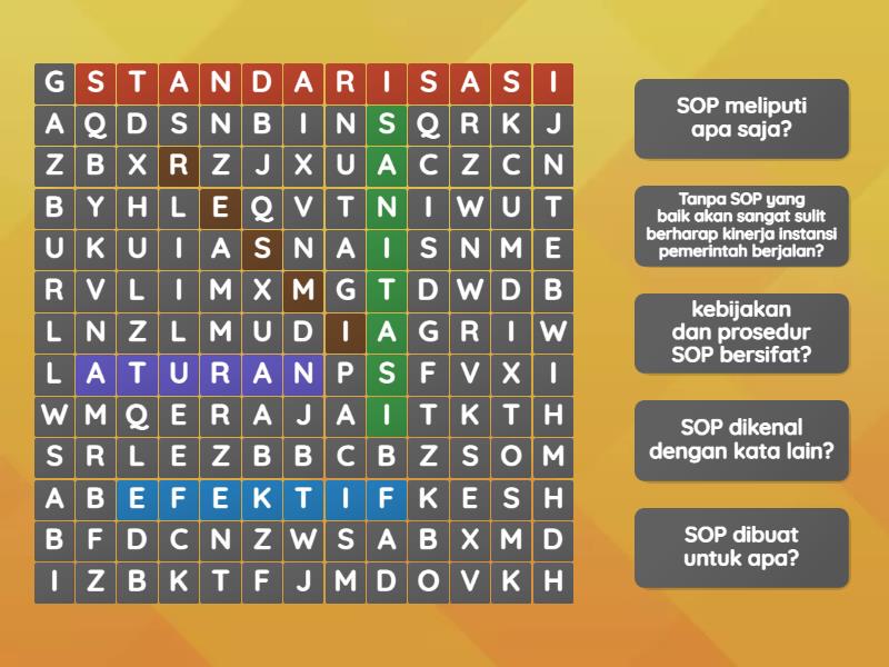 SANITASI - SOP dikenal dengan kata lain?, ATURAN - SOP meliputi apa saja?, STANDARISASI - SOP dibuat untuk apa?, EFEKTIF - Tanpa SOP yang baik akan sangat sulit berharap kinerja instansi pemerintah berjalan?, RESMI - kebijakan dan prosedur SOP bersifat?,