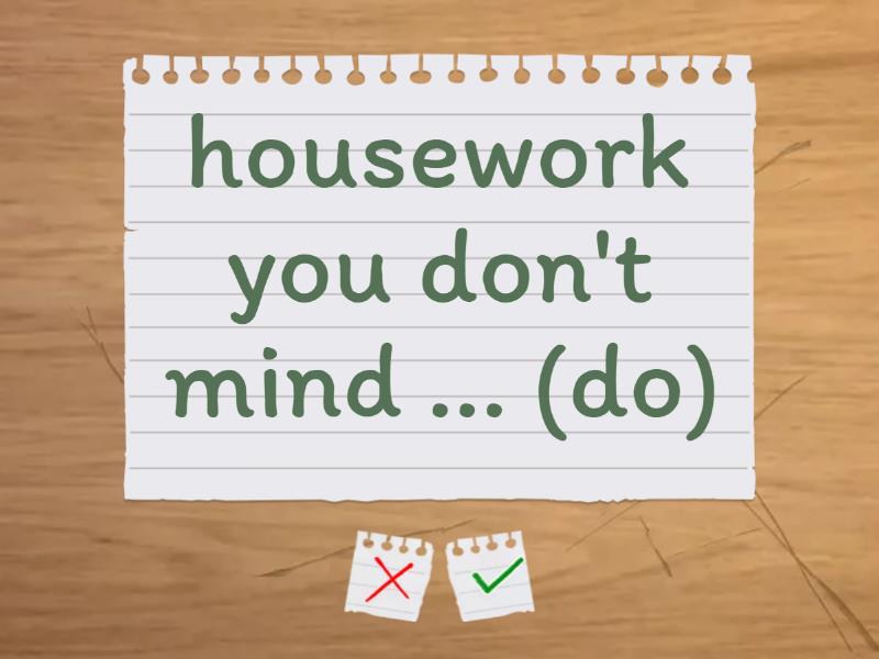 a place you wouldn’t choose ... (go) on holiday - to go, something you enjoyed ... (do) as a child - doing, something you needed ... (do) last week - to do, housework you hate ... (do) - doing, something you can't imagine ... (wear) - wearing, what you expect ... (do) this summer - to do, a place you avoid ... (go) in your town/city - going, a book you didn't finish ... (read) - reading, a song you love ... (listen) to - listening, some food you would like ... (eat) tonight - to eat, a place you hope ... (visit) in the future - to visit, housework you don't mind ... (do) - doing,