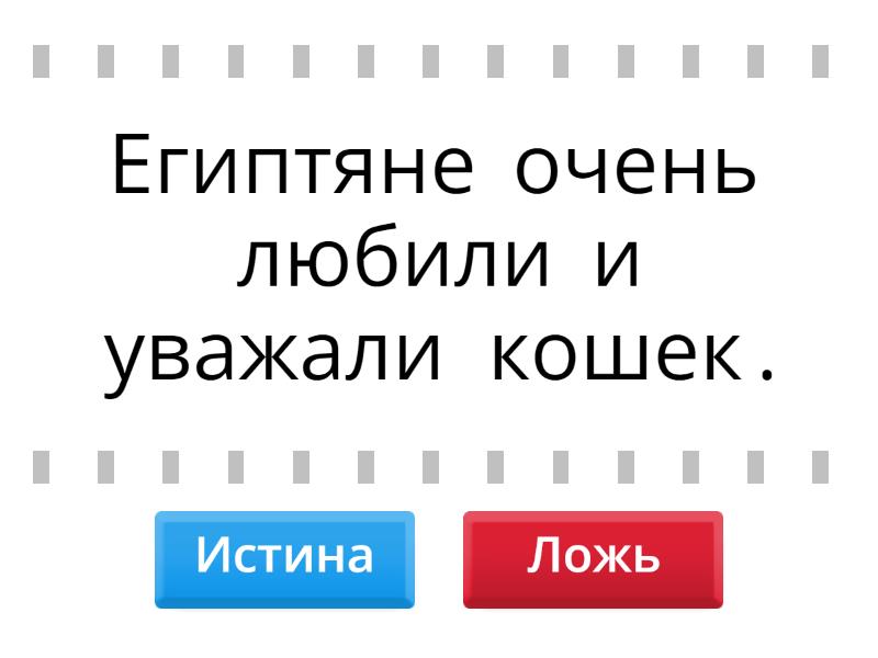 Истина: Египтяне очень любили и уважали кошек., У Сфинкса было тело льва, а голова человека или животного., Ложь: У фараона Рамсеса был ручной крокодил., Фараон охранял пирамиды., Сфинкс - правитель Древнего Египта,
