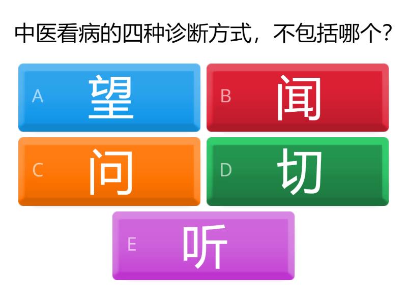 1) 中医看病的四种诊断方式,不包括哪个? a) 望 b) 闻 c) 问 d) 切 e) 听 2) 下面哪一种是中医看病的方式? a) 量体温 b) 量血压 c) 把脉 d) 听心肺 e) 测血氧饱和度 3) 观察病人的表情、动作,舌苔和舌象,是中医的哪一种诊断方式? a) 望诊 b) 闻诊 c) 问诊 d) 切诊 4) 下面哪一种是健康人群的正常舌象? a) 胖大舌,薄白苔 b) 裂纹舌,黄腻苔 c) 淡红舌,薄白苔 d) 通红舌,白腻苔 5) 对于医生判断病因,哪一种中医的诊断方式是最有帮助的? a) 望诊 b) 闻诊 c) 问诊 d) 切诊 6) 中医师用哪三根手指为病人把脉? a) 大拇指,食指和中指 b) 大拇指,中指和小拇指 c) 食指,中指和无名指 d) 中指,无名指和小拇指 7) 中医给病人把脉的位置是? a) 手腕桡动脉 b) 大腿股动脉 c) 颈部颈动脉 d) 脚面足动脉 8) 中医的治疗方法包括下面哪些? a) 中草药 b) 针灸 c) 艾灸 d) 拔罐 e) 推拿 f) 以上都是 9) 中医的针灸、艾灸等治疗方法,都是通过刺激哪里来进行治疗的? a) 气、血 b) 经络穴位 c) 阴阳 d) 五行 10) 感冒鼻塞,可以按揉哪个穴位来缓解症状? a) (对侧的)孔最穴 b) 鸠尾穴 c) 足三里 11) 晕车晕船,可以一边吐气,一边按压哪个穴位来缓解? a) 孔最穴 b) 鸠尾穴 c) 足三里 12) 既能缓解胃痛,又能提高免疫的穴位是哪个? a) 孔最穴 b) 鸠尾穴 c) 足三里 13) 中医追求的目标是? a) 保护健康,不生病 b) 小病不治,治大病 c) 急病不治,治慢病 14) 中医认为,如何让身体阴阳五行都平衡而保持健康呢? a) 生活顺应自然节奏 b) 避免过分刺激和变化 c) 经常留意身体情况 d) 以上都是 15) 中医认为以下说法正确的都有哪些? a) 上医医未病之病 b) 中医医将病之病 c) 下医医已病之病 d) 以上都对!