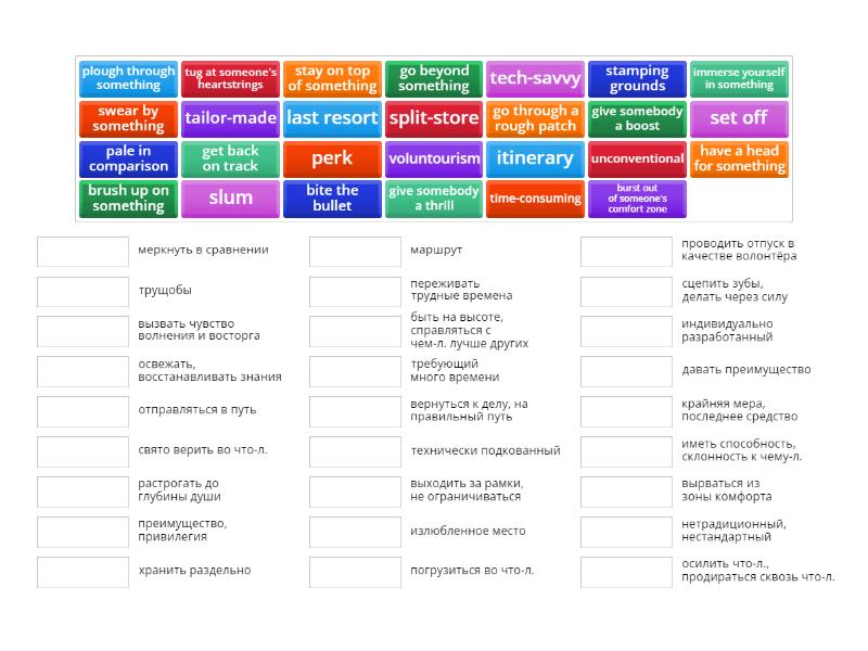 bite the bullet - сцепить зубы, делать через силу, burst out of someone's comfort zone - вырваться из зоны комфорта, brush up on something - освежать, восстанавливать знания, get back on track - вернуться к делу, на правильный путь, give somebody a boost - давать преимущество, give somebody a thrill - вызвать чувство волнения и восторга, go beyond something - выходить за рамки, не ограничиваться, go through a rough patch - переживать трудные времена, have a head for something - иметь способность, склонность к чему-л., immerse yourself in something - погрузиться во что-л., itinerary - маршрут, last resort - крайняя мера, последнее средство, pale in comparison - меркнуть в сравнении, perk - преимущество, привилегия, plough through something - осилить что-л., продираться сквозь что-л., set off - отправляться в путь, slum - трущобы, stamping grounds - излюбленное место, stay on top of something - быть на высоте, справляться с чем-л. лучше других, split-store - хранить раздельно, swear by something - свято верить во что-л., tailor-made - индивидуально разработанный, tech-savvy - технически подкованный, time-consuming - требующий много времени, tug at someone's heartstrings - растрогать до глубины души, voluntourism - проводить отпуск в качестве волонтёра, unconventional - нетрадиционный, нестандартный,