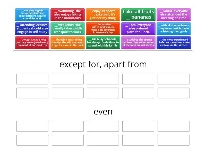 except for, apart from: I like all fruits __ bananas, __ studying English, I also enjoy learning about different cultures around the world, __ his busy schedule, he always finds time to spend with his family, __ Maria, everyone else attended the meeting on time, __ swimming, she also enjoys hiking in the mountains, I enjoy all sports __basketball; it's just not my thing., __ studying, she spends her free time volunteering at the local animal shelter, __ Tom, everyone else ordered pizza for lunch., __ attending lectures, students should also engage in self-study, __ weekends, she usually takes public transport to work, even: __ though it was raining heavily, she still managed to go for a run in the park, __ the most experienced chefs can sometimes make mistakes in the kitchen, __ though it was a long journey, we enjoyed every moment of our road trip, __ the smallest acts of kindness can make a big difference in someone's day, __ with all the problems, they never lost hope in achieving their goals,