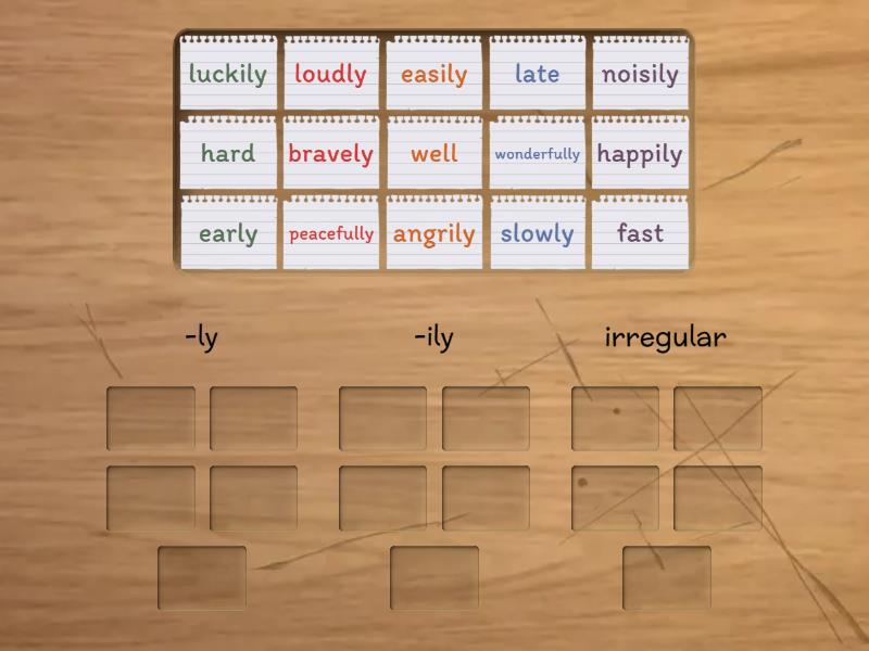 -ly: slowly, bravely, loudly, peacefully, wonderfully, -ily: easily, angrily, noisily, happily, luckily, irregular: fast, well, late, early, hard,