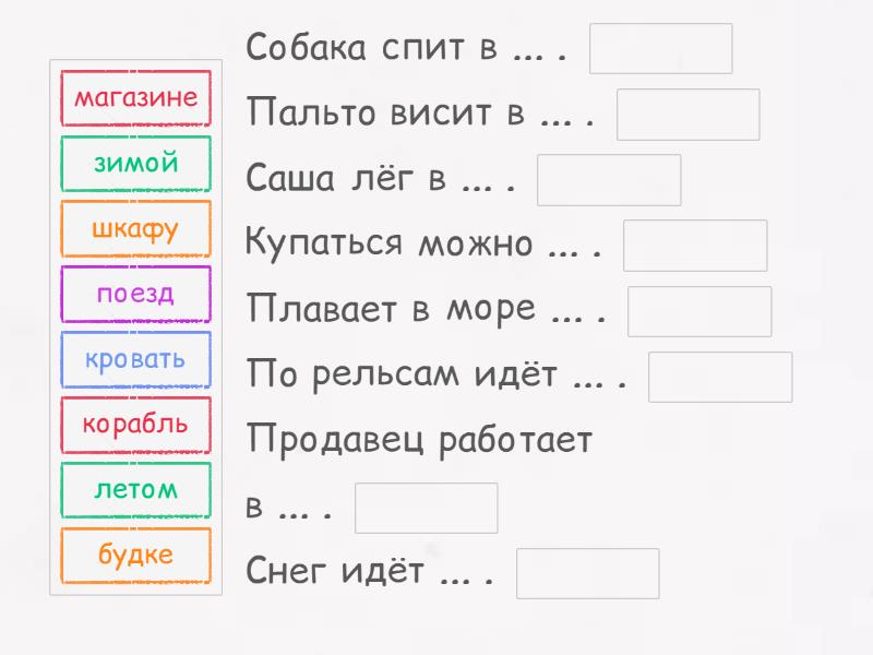 Собака спит в ... . ____ Пальто висит в ... . ____ Саша лёг в ... . ____ Купаться можно ... . ____ Плавает в море ... . ____ По рельсам идёт ... . ____ Продавец работает в ... . ____ Снег идёт ... . ____