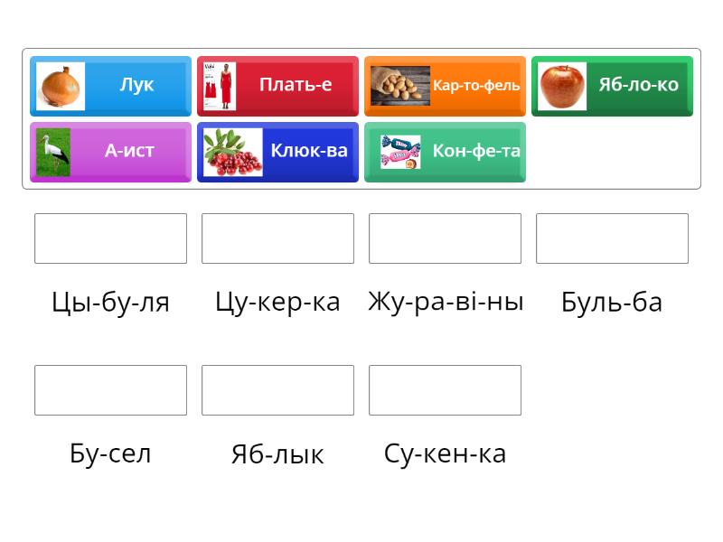 Яб-ло-ко - Цу-кер-ка, Лук - Бу-сел, А-ист - Яб-лык, Кар-то-фель - Су-кен-ка, Плать-е - Жу-ра-ві-ны, Кон-фе-та - Цы-бу-ля, Клюк-ва - Буль-ба,