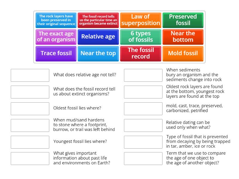 Mold fossil - When sediments bury an organism and the sediments change into rock, Preserved fossil - Type of fossil that is prevented from decaying by being trapped in tar, amber, ice or rock, Trace fossil - When mud/sand hardens to stone where a footprint, burrow, or trail was left behind, 6 types of fossils - mold, cast, trace, preserved, carbonized, petrified, The fossil record - What gives important information about past life and environments on Earth?, The fossil record tells us the particular time an organism became extinct - What does the fossil record tell us about extinct organisms?, The exact age of an organism - What does relative age not tell?, Relative age - Term that we use to compare the age of one object to the age of another object?, Near the top - Youngest fossil lies where?, Near the bottom - Oldest fossil lies where?, Law of superposition - Oldest rock layers are found at the bottom, youngest rock layers are found at the top, The rock layers have been preserved in their original sequence - Relative dating can be used only when what?,