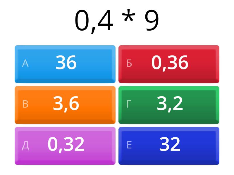 1) 0,4 * 9 a) 36 b) 0,36 c) 3,6 d) 3,2 e) 0,32 f) 32 2) 0,6 * 4 a) 2,4 b) 24 c) 0,24 d) 3,2 e) 36 f) 3,6 3) 0,6 * 0,8 a) 48 b) 4,8 c) 0,48 d) 36 e) 0,36 f) 6,4 4) 0,5 * 0,1 a) 0,5 b) 5 c) 0,05 d) 0,005 e) 50 f) 0,6 5) 3,2 * 0,5 a) 1,6 b) 0,16 c) 16 d) 160 e) 15,1 f) 150 6) 9,3 * 0,3 a) 279 b) 2,79 c) 27,9 d) 276 e) 27,6 f) 2,76 7) 1,5 * 2 a) 30 b) 3 c) 2,1 d) 0,3 e) 1,7 f) 0,03 8) 2,2 * 10 a) 22 b) 0,22 c) 220 d) 32 e) 2,02 f) 20,2 9) 10,5 * 4 a) 402 b) 42 c) 40,2 d) 4,02 e) 40 f) 40,5 10) 2,15 * 100 a) 21500 b) 2150 c) 215 d) 21,5 e) 0,215 f) 0,0215