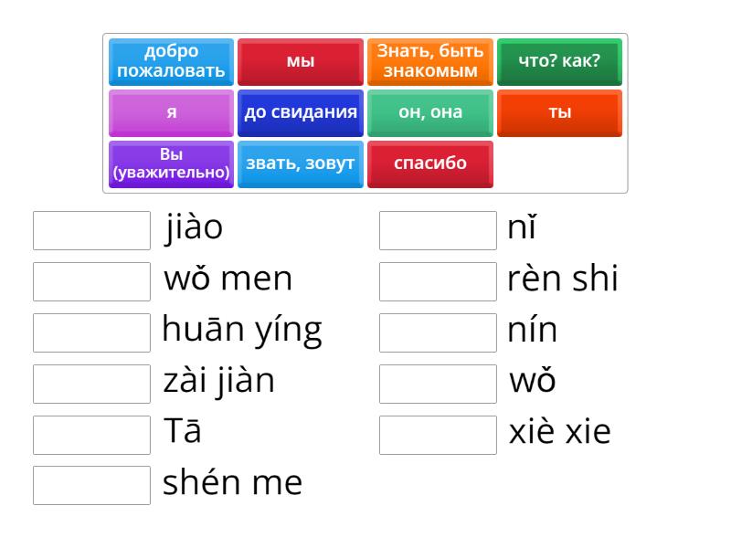 я - wǒ, ты - nǐ, он, она - Tā, Вы (уважительно) - nín, Знать, быть знакомым - rèn shi, добро пожаловать - huān yíng, звать, зовут - jiào, спасибо - xiè xie, что? как? - shén me, мы - wǒ men, до свидания - zài jiàn,