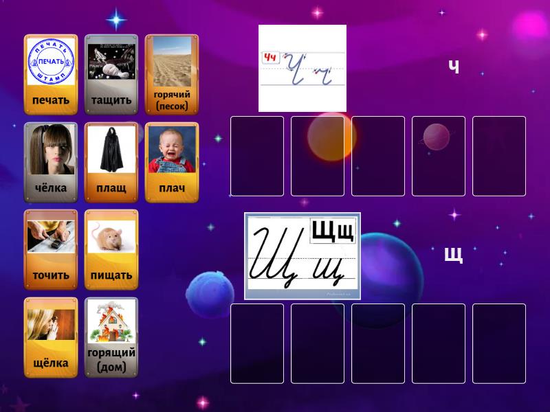 Ч: чёлка, горячий (песок), плач, печать, точить, Щ: щёлка, плащ, пищать, горящий (дом), тащить,
