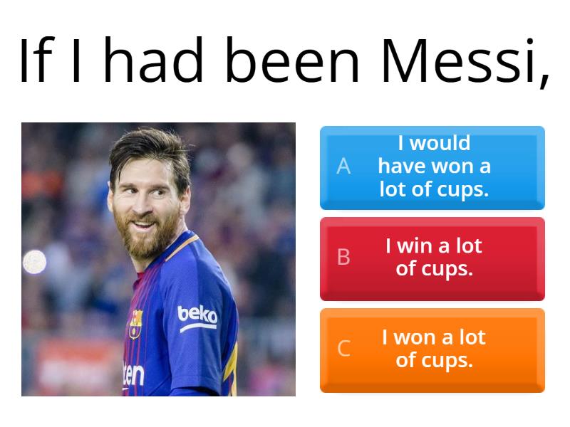 1) If I had been Messi, a) I won a lot of cups. b) I win a lot of cups. c) I would have won a lot of cups. 2) If Tom had had a lot of money, a) he would buy a new house. b) he would have bought a new house. c) he bought a new house. 3) If Susan had been a pilot, a) she would have travelled around the world. b) she travelled around the world. c) she would travel around the world . 4) If my friends had lived in Brazil, a) they speak Portugueses.  b) they would have spoken Portuguese. c) they spoke Portuguese. 5) If I had been a guitarist, a) I would have played in a band. b) I played in a band. c) I would play in a band. 6) If Sarah had been a teacher, a) she teaches Maths. b) she would have taught Maths. c) she taught Maths. 7) If Robert and Sam had been architects, a) they build hotels. b) they built hotels. c) they would have built hotels. 8) If Juliet had been a famous singer, a) she sings in a stadium. b) she would have sung in a stadium. c) she would sing in a stadium. 9) If my sister had had a car, a) she would have travelled to many provinces. b) she travels to many provinces. c) she travelled to many provinces. 10) If Jim had lived in the countryside, a) he had many animals. b) he has many animals. c) he would have had many animals.