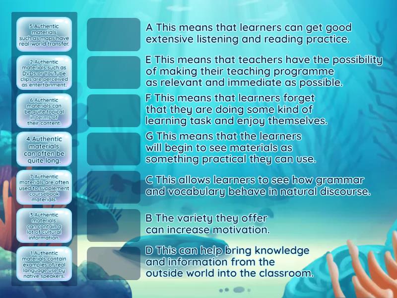 1 Authentic materials contain examples of real language use by native speakers. - C This allows learners to see how grammar and vocabulary behave in natural discourse., 2 Authentic materials such as DVDs or YouTube clips are perceived as entertainment. - F This means that learners forget that they are doing some kind of learning task and enjoy themselves., 3 Authentic materials can contain a lot of cultural information. - D This can help bring knowledge and information from the outside world into the classroom., 4 Authentic materials can often be quite long. - A This means that learners can get good extensive listening and reading practice., 5 Authentic materials such as maps have real-world transfer. - G This means that the learners will begin to see materials as something practical they can use., 6 Authentic materials can be quite topical in terms of their content. - E This means that teachers have the possibility of making their teaching programme as relevant and immediate as possible., 7 Authentic materials are often used to supplement coursebook materials. - B The variety they offer can increase motivation.,