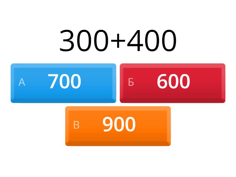 1) 300+400 a) 600 b) 700 c) 900 2) 500+30 a) 530 b) 600 c) 550 3) 699+1 a) 800 b) 700 c) 698 4) 330+70 a) 390 b) 300 c) 400 5) 600+200 a) 800 b) 700 c) 600 6) 390+10 a) 410 b) 400 c) 405 7) 100+700 a) 800 b) 900 c) 700 8) 300+5 a) 295 b) 350 c) 305 9) 450+20 a) 430 b) 460 c) 470 10) 630+200 a) 530 b) 830 c) 930