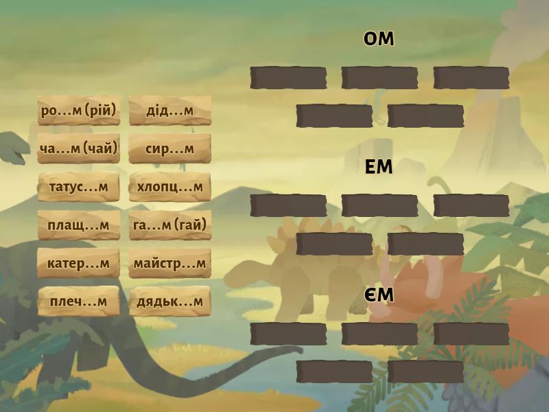 ОМ: майстр...м, дід...м, катер...м, дядьк...м, сир...м, ЕМ: хлопц...м, татус...м, плеч...м, плащ...м, ЄМ: ча...м (чай), га...м (гай), ро...м (рій),