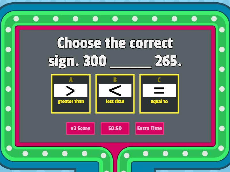 1) Choose the correct sign. 300 ______ 265. a) greater than b) less than c) equal to 2) 185 is ______ 195. What is the correct answer? a) equal to b) less than c) greater than 3) Which of the following are equal numbers? a) 155 = 146 b) 100 = 100 c) 100 = 74 4) Which of the following are equal numbers? a) 210 = 278 b) 62 = 39 c) 123 = 123 5) Choose the correct sign. 158 ______89 a) equal to b) greater than c) less than 6) Which among the following is correct? a) 109 is greater than 234 b) 23 is less than 67 c) 182 is equal to 128 7) Which among the following is correct? a) 123 is greater than 233 b) 191 is less than 112 c) 142 is equal to 142 8) 220 is _______ 188. a) greater than b) less than c) equal to 9) 90 is _______ 90. a) equal to b) less than c) greater than 10) 87 is _______ 144. a) equal to b) less than c) greater than 11) Choose the correct sign. 25 ______10. a) equal to b) less than c) greater than 12) Choose the correct sign. 66 is _______ 96. a) equal to b) less than c) greater than 13) Which of the following are equal numbers? a) 135= 145 b) 271= 300 c) 158=158 14) 234 is _______ 300. a) equal to b) less than c) greater than 15) 149 is _______ 45. a) equal to b) less than c) greater than