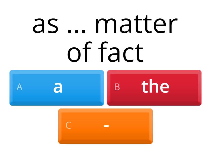 1) as ... matter of fact a) a b) the c) - 2) out of ... work a) a b) the c) - 3) in .... person - лично a) a b) the c) - 4) day after ... day a) a b) the c) - 5) lose ... hope - терять надежду a) a b) the c) - 6) on ... whole - в целом a) a b) the c) - 7) feel under .... weather a) a b) the c) - 8) on ... other hand - с другой стороны a) an b) the c) - 9) in ... addition to smth - вдобавок к чему-л. a) an b) the c) - 10) at ... work a) a b) the c) - 11) take ... break a) a b) the c) - 12) for ... while - на какое-то время, ненадолго a) a b) the c) - 13) stay in ... touch a) a b) the c) - 14) free of .... charge - бесплатно a) a b) the c) - 15) bear in .... mind a) a b) the c) - 16) keep in ... touch a) a b) the c) - 17) keep in .... mind a) a b) the c) - 18) have a lot in ... common - иметь много общего a) a b) the c) - 19) make ... decision - принять решение a) a b) - 20) be at .... risk - находиться под угрозой a) a b) the c) - 21) give ... hand - помочь, оказать помощь a) a b) the c) - 22) at ... sunrise - на рассвете a) a b) the c) - 23) have ... fun a) a b) the c) - 24) hand in ... hand a) a b) the c) - 25) at .... sunset - на закате a) a b) the c) - 26) make ... sense - иметь смысл a) a b) the c) - 27) ... common sense - здравый смысл a) a b) the c) - 28) fall in .... love with sb - влюбиться в кого-то a) a b) the c) - 29) take ... care of sb - заботиться о ком-то a) a b) the c) - 30) lose ... heart - потерять мужество, бодрость духа a) a b) the c) - 31) in ... detail a) a b) the c) - 32) make ... use of smth - использовать что-л. a) a b) the c) - 33) at ... first sight a) a b) the c) - 34) from morning till ... night a) a b) the c) - 35) at ... weekend a) a b) the c) - 36) take into .... consideration - принимать во внимание a) a b) the c) - 37) in ... danger a) a b) the c) - 38) by ... mistake - по ошибке a) a b) the c) - 39) in ... general - вообще, в целом a) a b) the c) - 40) on ... fire - охваченный огнем a) a b) the c) -