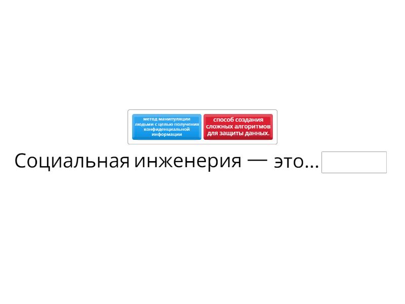 Социальная инженерия — это...____ Слабый пароль может стать причиной ____ Использование брандмауэра помогает____ После успешной кибератаки данные могут быть...____ Кибератака это - ____ Основная цель фишинговой атаки —____ Защита от кибератак включает...____ Одним из видов кибератак является DDoS-атака, которая...____