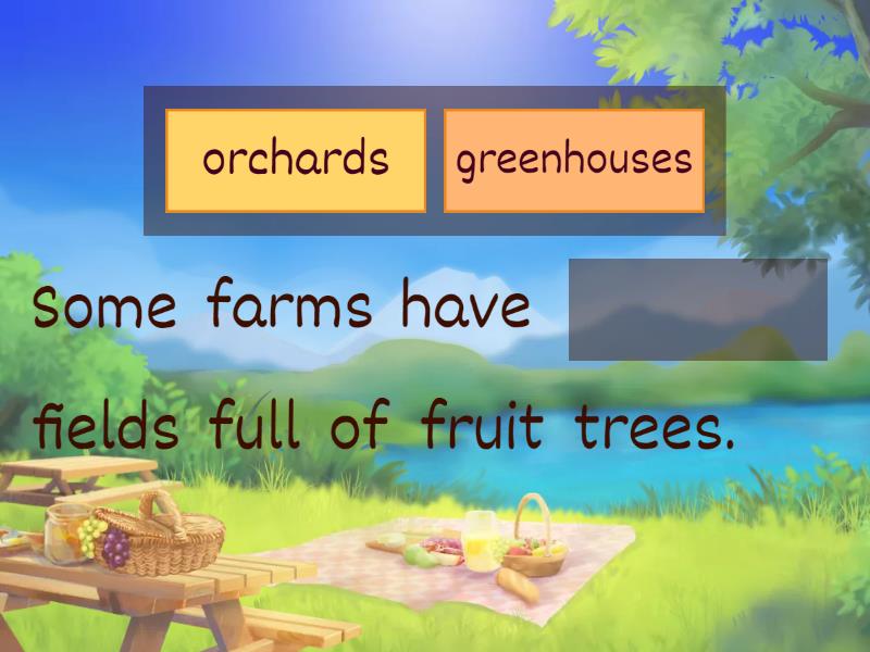 Some farms have ____ fields full of fruit trees. ____ protect sensitive plants form rain, wind, and cold. Tea, coffe, bananas and ____ often grow on bigger farms. We call bigger farms in hot countries ____ . Cheese, butter, and yogurt are all ____ ____ is another name for farm animals. Food made in factories is ____ ____ are not very good for us.