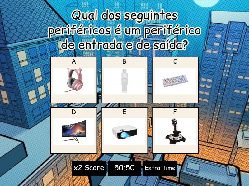 1) Qual dos seguintes periféricos  é um periférico de entrada e de saída?  a) b) c) d) e) f) 2) Qual das seguintes imagens é um sistema de software? a) b) c) d) e) f) 3) Qual das seguintes imagens é uma aplicação de software? a) b) c) d) e) f) 4) Qual dos seguintes periféricos é um periférico de entrada? a) b) c) d) e) f) 5) Qual dos seguintes periféricos é um periférico  de armazenamento? a) b) c) d) e) f) 6) Qual das seguintes imagens é uma aplicação de software? a) b) c) d) e) f) 7) Qual dos seguintes periféricos é um periférico de saída? a) b) c) d) e) f) 8) São exemplos de hardwares, EXCETO: a)  monitor, tecla b) placa-mãe, disco-rígido. c) rato, caixa de som. d) Windows, Linux. e) projetor, joystick f) câmara, óculos de RV 9) É um: a) Periférico de entrada e de saída b) sistema de software c) Periférico de saída  d) Aplicação de software e) Periférico de entrada f) Periférico de armazenamento 10) Qual é a mais pequena unidade de informação? a) 1 Megabyte (MB) b) 1 Quilobyte (KB) c) 1 Exabyte (EB) d) 1 Bit e) 1 Terabyte (TB) f) 1 Gigabyte (GB) 11) Quantos caracteres pode possuir o título de um documento? a) 8 b) 250 c) 700 d) 50 e) 3 f) 256 12) A maior unidade de medida informática é o yottabyte. a) Verdadeiro b) Falso 13) As passwords devem ser só com minúsculas. a) Verdadeiro b) Falso 14) Devemos ou não usar firewall? a) Sim b) Não