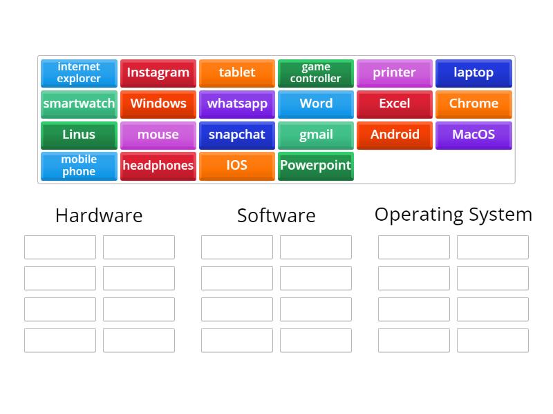 Hardware: mouse, laptop, printer, smartwatch, mobile phone, tablet, game controller, headphones, Software: internet explorer, gmail, whatsapp, snapchat, Instagram, Excel, Powerpoint, Word, Operating System: IOS, Windows, Chrome, Android , Linus, MacOS,