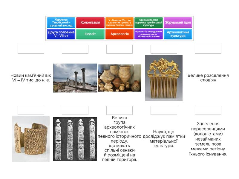 Історія - Наука, яка вивчає минуле людства, покладаючись при цьому на письмові та матеріальні свідчення минулих подій., Історія України - Наука, що вивчає процес розвитку українського народу, Хронологія - Послідовність певних подій у часі., Історичне джерело - Речова або писемна пам’ятка, створена в процесі діяльності людини і збережена до наших днів, що дозволяє вивчати минуле людського суспільства й відображає його історичний розвиток, Археологія - Наука, що досліджує пам’ятки матеріальної культури., Цивілізація - Людська спільнота, яка впродовж певного періоду часу (процес зародження, розвиток, загибель чи перетворення цивілізації) має стійкі особливі риси в соціально-політичній організації, економіці та культурі (науці, технологіях, мистецтві тощо), спільні духовні цінності та ідеали, ментальність (світогляд)., Археологічна культура - Велика група археологічних пам’яток певного історичного періоду, що мають спільні ознаки й розміщені на певній території., Палеоліт - Ранній кам’яний вік. 1 млн. – 11 тис. років тому, Мезоліт - Середній кам’яний вік. 11 тис. років тому – VІ тис. до н.е., Неоліт - Новий кам’яний вік VI – IV тис. до н. е., Неолітична революція - Термін, яким англійський археолог Гордон Чайлд визначив зміни, що відбувалися в епоху неоліту – останню добу кам’яного віку. У їх основі був перехід від привласнювального до відтворювального господарства., Енеоліт - Мідно-кам’яний вік IV – ІІІ тис. до н. е., Бронзовий вік - Історичний період, при якому для виготовлення знарядь праці почали використовувати сплав міді та олова – бронзу. Початок ІІ – початок І тис. до н. е., Ранній залізний вік - Початок застосування заліза. ІХ ст. до н.е. - ІV ст. н.е., Привласнювальне господарство - Господарство, за якого люди брали у природи все необхідне для життя в готовому вигляді., Відтворювальне (продуктивне) господарство - Господарство, що ґрунтується на самостійному виробництві людиною необхідних для життя засобів., Колонізація - Заселення переселенцями (колоністами) незайманих земель поза межами регіону їхнього існування., Кочовик - Представник народу, що з економічних, традиційно-культурних або інших причин не мають постійного нерухомого житла і переміщується з одного місця на інше., Курган - Могила, земляний насип над стародавнім похованням, рідше – кам’яний., IV - середина III тис. до н. е. - - Розселення племен трипільської і середньостогівської археологічних культур, VIII-VI ст. до н. е. - Велика грецька колонізація, Друга половина V - VII ст - Велике розселення слов’ян, Браслет із меандровим орнаментом із Мізинської стоянки, Орнаментована кераміка трипільської культури, V - Початок IV ст. до н.е.золотий гребінь із кургану Солоха - кінець , Золота пектораль із кургану Товста Могила- IVст. дон. е, Херсонес Таврійський - сучасний вигляд, Збруцький ідол,