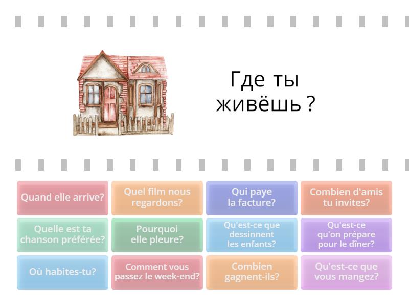 Où habites-tu? - Где ты живёшь?, Quand elle arrive? - Когда она приезжает?, Combien gagnent-ils? - Сколько они зарабатывают?, Pourquoi elle pleure? - Почему она плачет?, Qu'est-ce que vous mangez? - Что вы едите?, Qui paye la facture? - Кто оплачивает счёт?, Quelle est ta chanson préférée? - Какая твоя любимая песня?, Combien d'amis tu invites? - Сколько друзей ты приглашаешь?, Qu'est-ce qu'on prépare pour le dîner? - Что мы готовим на ужин?, Qu'est-ce que dessinnent les enfants? - Что рисуют дети?, Comment vous passez le week-end? - Как вы проводите выходные?, Quel film nous regardons? - Какой фильм мы смотрим?,