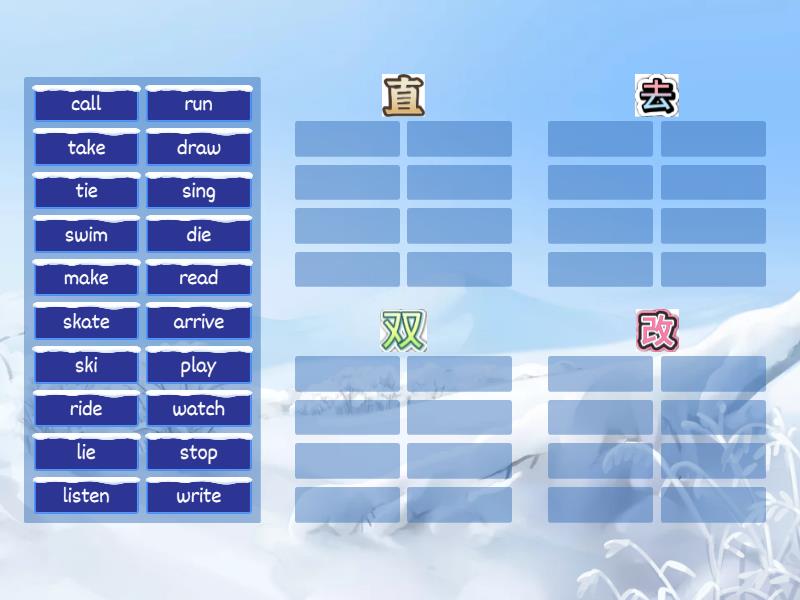 : play, read, sing, listen, call, watch, draw, ski, : take, write, ride , arrive , make , skate, : swim, run, stop, : tie, die, lie,