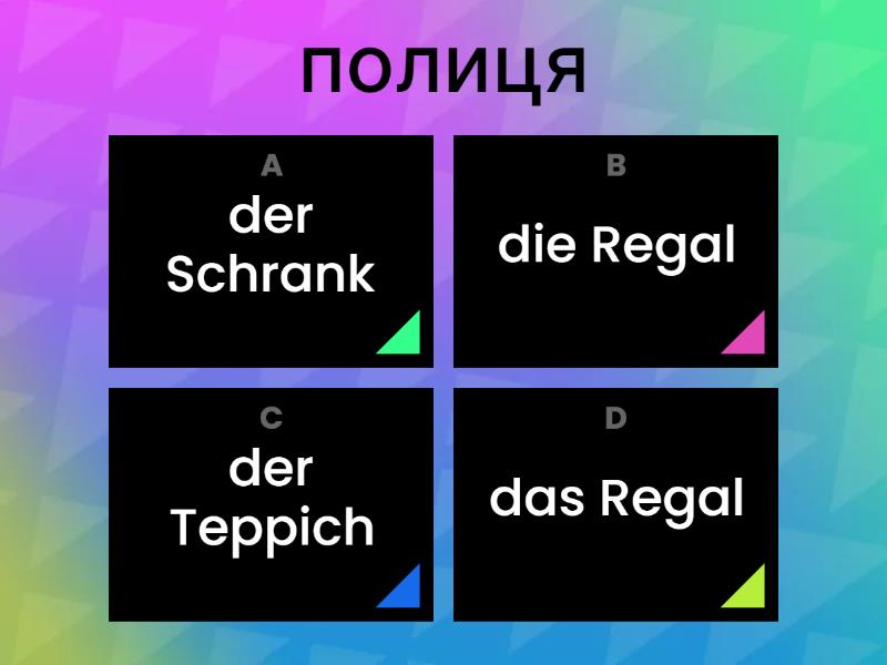 1) стіл a) der Tisch b) die Tisch c) das Regal d) der Schrank 2) килим a) das Teppich b) der Teppich c) die Teppich d) die Teppiche 3) диван a) der Sofa b) der Stuhl c) das Sofa d) die Sofa 4) ліжко a) das Bett b) das Sofa c) das Doppelstockbett d) der Sessel 5) полиця a) der Schrank b) das Regal c) die Regal d) der Teppich 6) двері a) die Tür b) das Fenster c) der Tür d) die Fenster