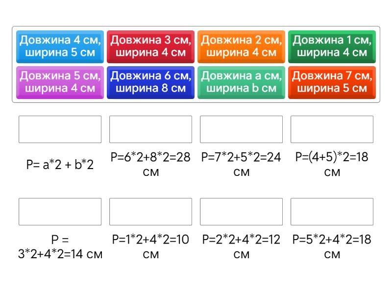 Довжина 3 см, ширина 4 см - Р = 3*2+4*2=14 см, Довжина 2 см, ширина 4 см - P=2*2+4*2=12 см, Довжина 5 см, ширина 4 см - P=5*2+4*2=18 см, Довжина 1 см, ширина 4 см - P=1*2+4*2=10 см, Довжина 4 см, ширина 5 см - P=(4+5)*2=18 см, Довжина 6 см, ширина 8 см - P=6*2+8*2=28 см, Довжина а см, ширина b см - P= a*2 + b*2, Довжина 7 см, ширина 5 см - P=7*2+5*2=24 см,