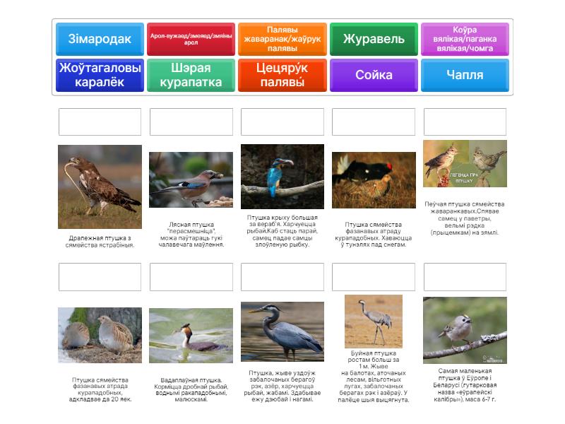 Жоўтагаловы каралёк - Самая маленькая птушка ў Еўропе і Беларусі (гутарковая назва «еўрапейскі калібры»), маса 6-7 г., Шэрая курапатка - Птушка сямейства фазанавых атрада курападобных, адкладвае да 20 яек., Арол-вужаед/змеяед/змяіны арол - Драпежная птушка з сямейства ястрабіныя., Коўра вялікая/паганка вялікая/чомга - Вадаплаўная птушка. Корміцца дробнай рыбай, воднымі ракападобнымі, малюскамі., Зімародак - Птушка крыху большая за вераб'я. Харчуецца рыбай.Каб стаць парай, самец падае самцы злоўленую рыбку. , Палявы жаваранак/жаўрук палявы - Пеўчая птушка сямейства жаваранкавых.Спявае самец у паветры, вельмі рэдка (прыцемкам) на зямлі., Чапля - Птушка, жыве уздоўж забалочаных берагоў рэк, азёр, харчуецца рыбай, жабамі. Здабывае ежу дзюбай і нагамі., Журавель - Буйная птушка ростам больш за 1 м. Жыве на балотах, аточаных лесам, вільготных лугах, забалочаных берагах рэк і азёраў. У палёце шыя выцягнута., Сойка - Лясная птушка "перасмешніца", можа паўтараць гукі чалавечага маўлення., Цецяру́к палявы́ - Птушка сямейства фазанавых атраду курападобных. Хаваюцца ў тунэлях пад снегам.,