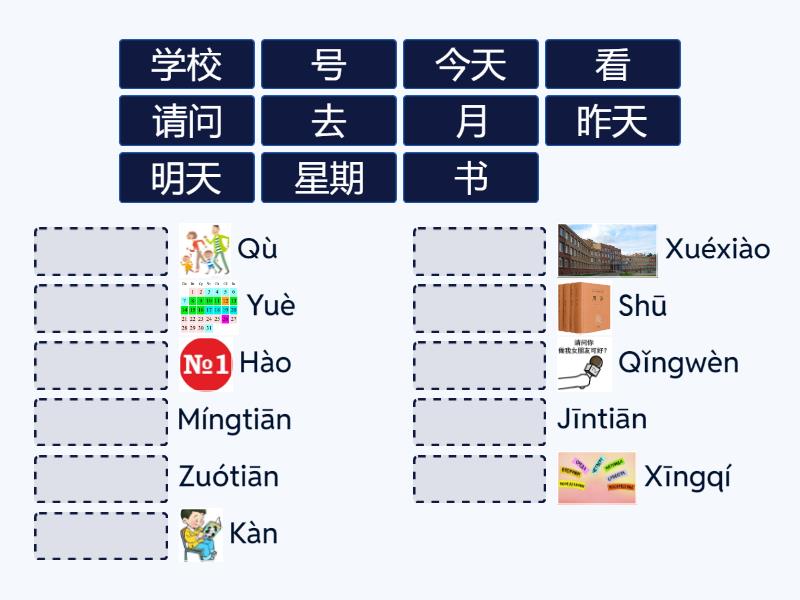 请问 - Qǐngwèn, 号 - Hào, 今天 - Jīntiān, 月 - Yuè, 星期 - Xīngqí, 昨天 - Zuótiān, 明天 - Míngtiān, 去 - Qù, 学校 - Xuéxiào, 看 - Kàn, 书 - Shū,