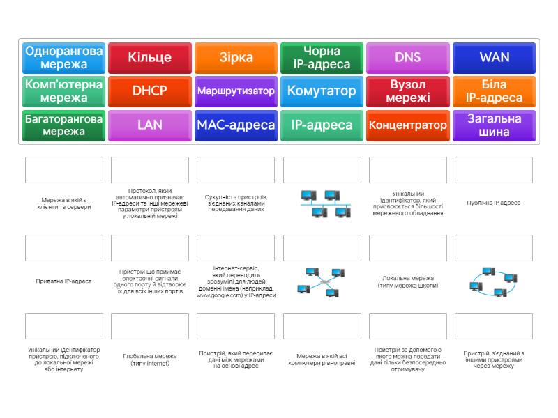 Комп’ютерна мережа - Сукупність пристроїв, з’єднаних каналами передавання даних, Вузол мережі - Пристрій, з’єднаний з іншими пристроями через мережу, LAN - Локальна мережа (типу мережа школи), WAN - Глобальна мережа (типу Internet), Загальна шина, Кільце, Зірка, Однорангова мережа - Мережа в якій всі компютери рівноправні, Багаторангова мережа - Мережа в якій є клієнти та сервери, Концентратор - Пристрій що приймає електронні сигнали одного порту й відтворює їх для всіх інших портів, Комутатор - Пристрій за допомогою якого можна передати дані тільки безпосередньо отримувачу, Маршрутизатор - Пристрій, який пересилає дані між мережами на основі адрес, MAC-адреса - Унікальний ідентифікатор, який присвоюється більшості мережевого обладнання, IP-адреса - Унікальний ідентифікатор пристрою, підключеного до локальної мережі або інтернету, Біла IP-адреса - Публічна IP адреса, Чорна IP-адреса - Приватна IP-адреса, DNS - Інтернет-сервіс, який переводить зрозумілі для людей доменні імена (наприклад, www.google.com) у IP-адреси, DHCP - Протокол, який автоматично призначає IP-адреси та інші мережеві параметри пристроям у локальній мережі,