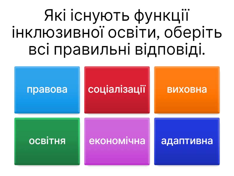 1) Які існують функції інклюзивної освіти, оберіть всі правильні відповіді. a) правова b) соціалізації c) виховна d) освітня e) економічна f) адаптивна 2) Чи існує різниця між традиційним освітнім процесом та інклюзивним освітнім процесом? a) Так b) Ні 3) Наукові здобутки яких наук можна застосувати в побудові освітнього процесу з дітьми з ООП? a) Філософія b) Спеціальна педагогіка c) Спеціальна психологія d) Соціологія e) Право f) Етика 4) Чи є різниця між асистентом вчителя і асистентом дитини? a) Так b) Ні 5) Яка роль асистента вчителя в інклюзивному класі? a) Допомагати в організації класу та збереженні дисципліни b) Допомагати дітям з особливими освітніми потребами в освітньому процесі c) Проводити уроки замість вчителя. 6) Чи пов'язана інклюзія лише з особами, які мають інвалідність? a) Так b) Ні