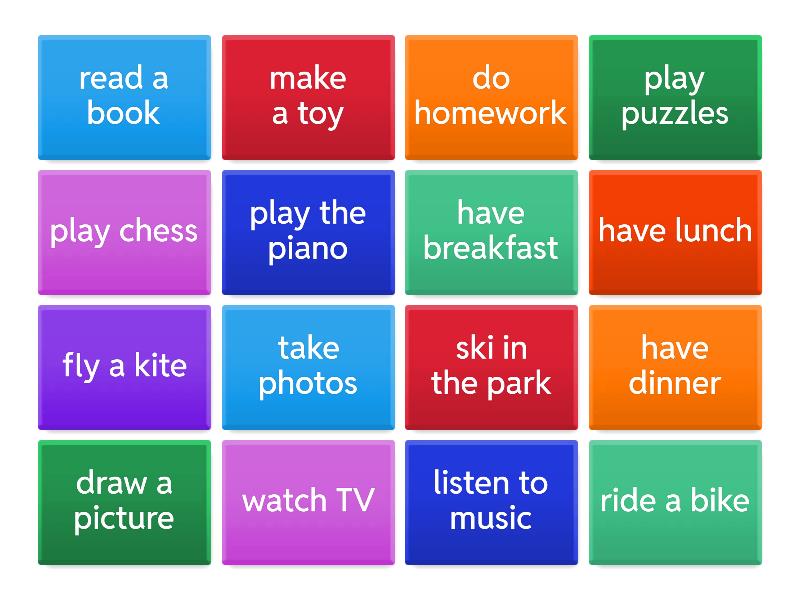 have lunch, have breakfast, have dinner, read a book, watch TV, do homework, draw a picture, ski in the park, play chess, listen to music, play the piano, take photos, play puzzles, make a toy, ride a bike, fly a kite,