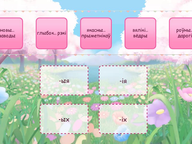 -ыя: чароўны... пасёлкі, новы... заводы, роўны... дарогі, зімовы... дні, -ія: летні.. ночы, кароткі... арэхі, глыбок... рэкі, вялікі... вёдры, -ых: чорнагаловы... грыбоў, жоўты... мячоў, якасны... прыметнікаў, дробны... арэхаў, -іх: ісці па шырокі.. вуліцах, плыве па марскі... прасторах, кароткі... перапынкаў, ранішні... кветак,