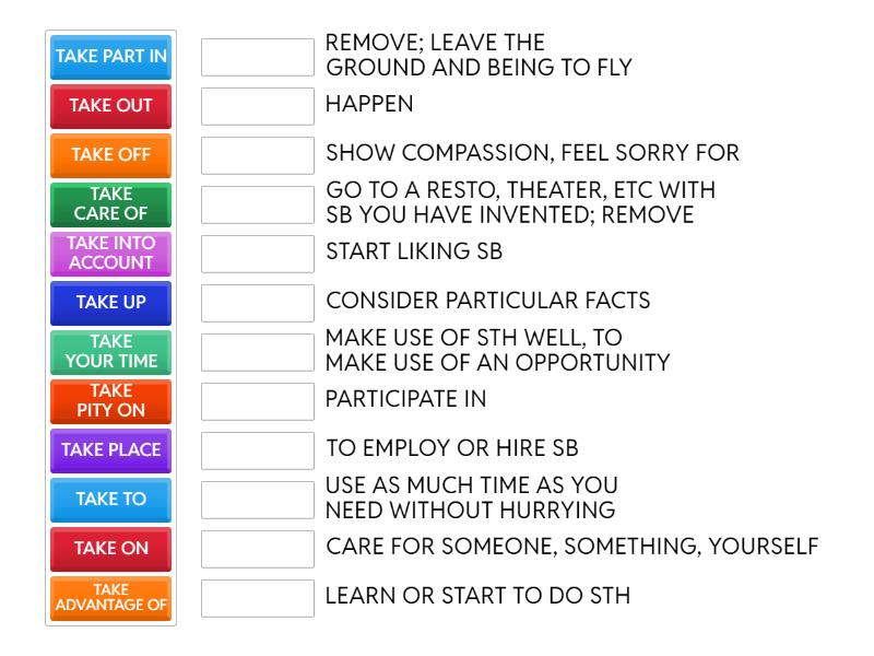 TAKE CARE OF - CARE FOR SOMEONE, SOMETHING, YOURSELF, TAKE ADVANTAGE OF - MAKE USE OF STH WELL, TO MAKE USE OF AN OPPORTUNITY, TAKE PLACE - HAPPEN, TAKE YOUR TIME - USE AS MUCH TIME AS YOU NEED WITHOUT HURRYING, TAKE INTO ACCOUNT - CONSIDER PARTICULAR FACTS, TAKE PART IN - PARTICIPATE IN, TAKE PITY ON - SHOW COMPASSION, FEEL SORRY FOR, TAKE OFF - REMOVE; LEAVE THE GROUND AND BEING TO FLY, TAKE UP - LEARN OR START TO DO STH, TAKE TO - START LIKING SB, TAKE ON - TO EMPLOY OR HIRE SB, TAKE OUT - GO TO A RESTO, THEATER, ETC WITH SB YOU HAVE INVENTED; REMOVE,