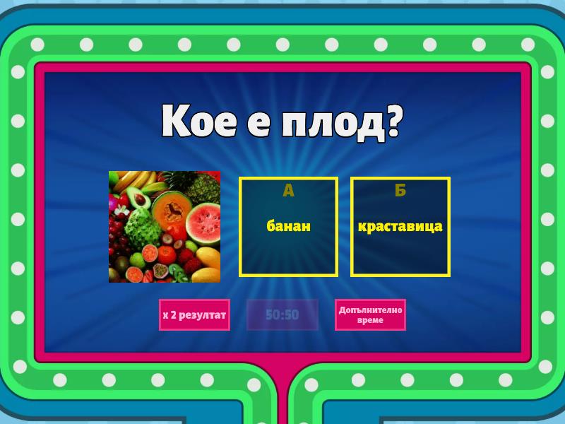 1) Кое е плод? a) банан b) краставица 2) Трябва ли да опазваме природата? Защо? a) Да,защото без нея не можем да живеем.  b) Не,защото не ни трябва. 3) Трябва ли да сечем дървета? a) Да b) Не 4) Трябва ли да обиваме птици? a) да b) не 5) Кое е вредно? a) фанта b) вода 6) Вреден ли е портокала? a) да b) не 7) Кравата дава ли мляко? a) да b) не 8) Зрънчото полезно ли е? a) да b) не 9) Чипсът вреден ли е? a) да b) не 10) Катерицата бозайник ли е? a) да b) не