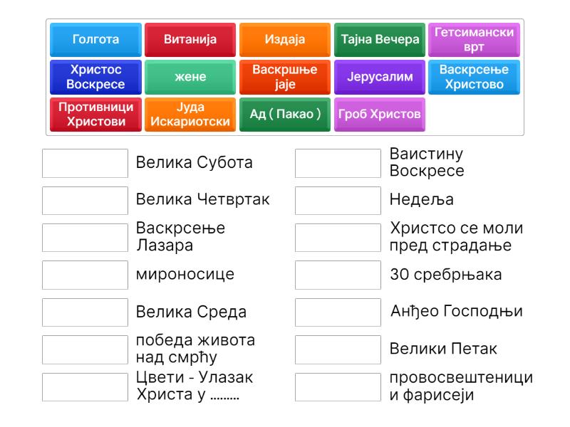 Јерусалим - Цвети - Улазак Христа у ........., Витанија - Васкрсење Лазара, Издаја - Велика Среда, Тајна Вечера - Велика Четвртак, Голгота - Велики Петак, Ад ( Пакао ) - Велика Субота, Васкрсење Христово - Недеља, Гроб Христов - Анђео Господњи, жене - мироносице, Противници Христови - провосвештеници и фарисеји, Васкршње јаје - победа живота над смрћу, Гетсимански врт - Христсо се моли пред страдање, Јуда Искариотски - 30 сребрњака, Христос Воскресе - Ваистину Воскресе,