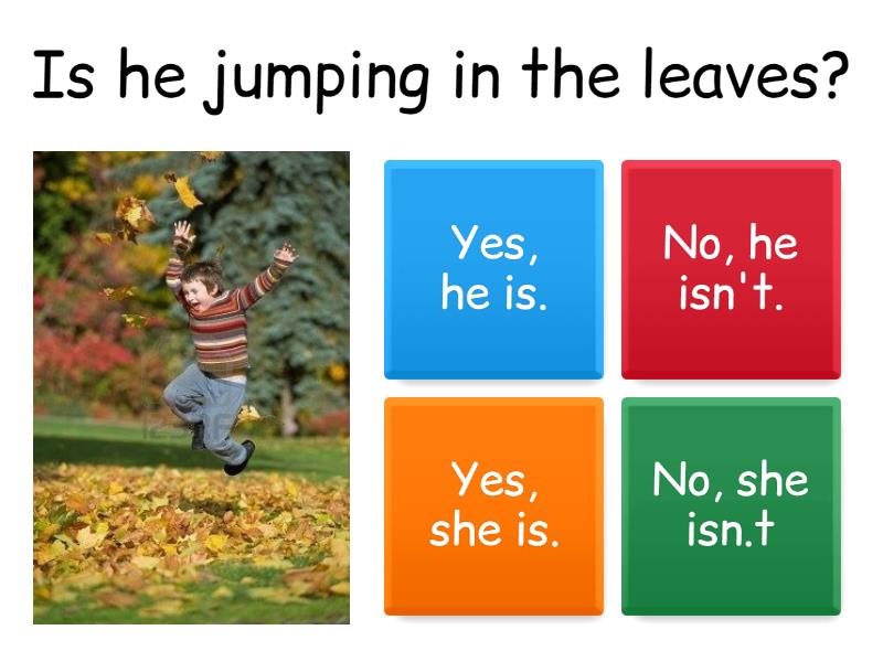 1) Is he jumping in the leaves? a) Yes, he is. b) No, he isn't. c) Yes, she is. d) No, she isn.t 2) Is he playing in the sand? a) Yes, he is. b) No, he isn't. c) Yes, she is. d) No, she isn.t 3) Is she walking along a path? a) Yes, he is. b) No, he isn't. c) Yes, she is. d) No, she isn.t 4) Is she running up a hill? a) Yes, he is. b) No, he isn't. c) Yes, she is. d) No, she isn.t 5) Is he swimming in a lake? a) Yes, he is. b) No, he isn't. c) Yes, she is. d) No, she isn.t 6) Is she playing tennis? a) Yes, he is. b) No, he isn't. c) Yes, she is. d) No, she isn.t 7) Is she riding a horse in the forest? a) Yes, he is. b) No, he isn't. c) Yes, she is. d) No, she isn.t 8) Is he walking across a bridge? a) Yes, he is. b) No, he isn't. c) Yes, she is. d) No, she isn.t 9) Is she listening to music? a) Yes, he is. b) No, he isn't. c) Yes, she is. d) No, she isn.t 10) Is she climbing a tree? a) Yes, he is. b) No, he isn't. c) Yes, she is. d) No, she isn.t