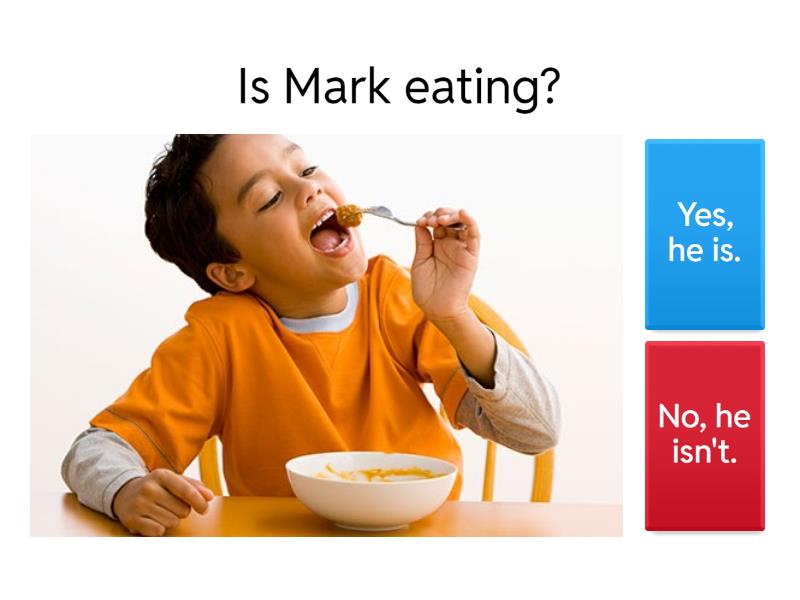 1) Is Mark eating? a) Yes, he is. b) No, he isn't. 2) Is she taking a photo? a) Yes, she is. b) No, she isn't. 3) Is John playing the piano? a) Yes, he is. b) No, he isn't. 4) Are they cooking? a) Yes, they are. b) No, they aren't. 5) Is it playing? a) Yes, it is. b) No, it isn't. c) Yes, it isn't. 6) Are the kids playing a computer game? a) No, they are b) No, they aren't. 7) Is he playing chess? a) No, he isn't. b) Yes, he is. 8) Is the girl listening to music? a) Yes, he is. b) Yes, she is. 9) Is the boy painting a picture? a) Yes, he is. b) No, he isn't. c) Yes, she is. 10) Are the boys playing football? a) Yes, they are. b) No, they aren't. 11) Are you doing your homework? a) Yes, I am b) No, I'm not