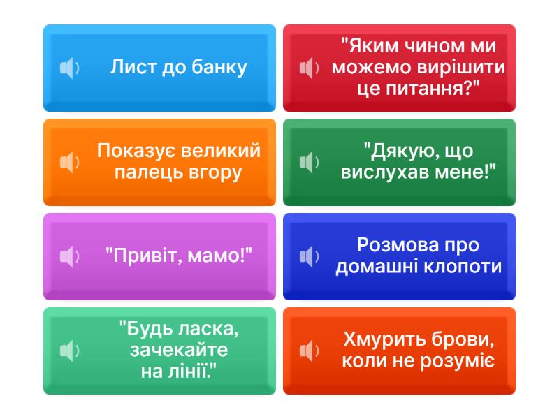 "Будь ласка, зачекайте на лінії." - Ділове спілкування, "Дякую, що вислухав мене!" - Дружнє спілкування, "Привіт, мамо!" - Сімейне спілкування, Показує великий палець вгору - Жест, Хмурить брови, коли не розуміє - Міміка, "Яким чином ми можемо вирішити це питання?" - Вербальне спілкування, Розмова про домашні клопоти - Невербальне спілкування, Лист до банку - Використання державної мови,