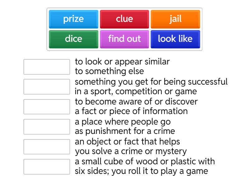 prize - something you get for being successful in a sport, competition or game, find out - to become aware of or discover a fact or piece of information, look like - to look or appear similar to something else, dice - a small cube of wood or plastic with six sides; you roll it to play a game, jail - a place where people go as punishment for a crime, clue - an object or fact that helps you solve a crime or mystery,