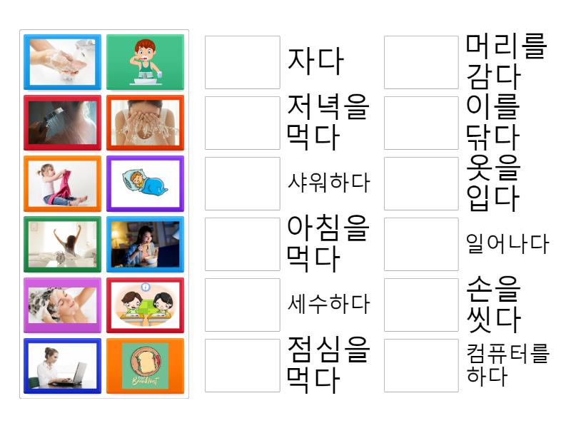 일어나다, 이를 닦다, 세수하다, 컴퓨터를 하다, 샤워하다, 자다, 아침을 먹다, 점심을 먹다, 저녁을 먹다, 머리를 감다, 옷을 입다, 손을 씻다,