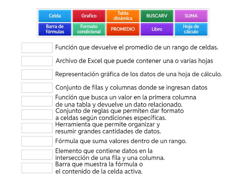 Hoja de cálculo - Conjunto de filas y columnas donde se ingresan datos, PROMEDIO - Función que devuelve el promedio de un rango de celdas., SUMA - Fórmula que suma valores dentro de un rango., Celda - Elemento que contiene datos en la intersección de una fila y una columna., Libro - Archivo de Excel que puede contener una o varias hojas, BUSCARV - Función que busca un valor en la primera columna de una tabla y devuelve un dato relacionado., Formato condicional - Conjunto de reglas que permiten dar formato a celdas según condiciones específicas., Grafico - Representación gráfica de los datos de una hoja de cálculo., Barra de fórmulas - Barra que muestra la fórmula o el contenido de la celda activa., Tabla dinámica - Herramienta que permite organizar y resumir grandes cantidades de datos.,