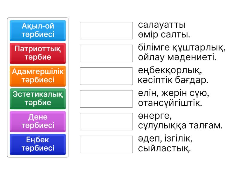 Ақыл-ой тәрбиесі - білімге құштарлық, ойлау мәдениеті., Адамгершілік тәрбиесі - әдеп, ізгілік, сыйластық., Эстетикалық тәрбие - өнерге, сұлулыққа талғам., Еңбек тәрбиесі - еңбекқорлық, кәсіптік бағдар., Дене тәрбиесі - салауатты өмір салты., Патриоттық тәрбие - елін, жерін сүю, отансүйгіштік.,
